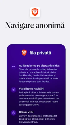 Confidențialitatea ta este prioritatea supremă pentru Browserul Web Brave. Aplicația integrează măsuri robuste de protecție, precum securitatea HTTPS pretutindeni, care criptează traficul de date, blocarea scripturilor și a cookie-urilor terțe, stopând colectarea invizibilă a informațiilor tale. Poți explora internetul cu file private, menținând anonimatul absolut. De asemenea, Browserul Web Brave oferă sincronizarea sigură a preferințelor și acces facil la istoricul și filele recente, totul printr-un motor de căutare rapidă. Misiunea Brave este de a reinventa web-ul deschis, un loc unde utilizatorii au controlul deplin, iar creativitatea este susținută într-un mediu respectuos.