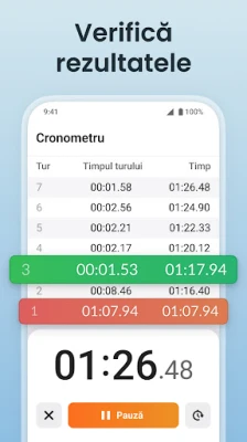 Pe lângă capacitățile sale extinse de temporizare, Cronometru + Temporizator integrează un cronometru de înaltă performanță, esențial pentru măsurători riguroase. Perfect adaptat pentru atleți, pasionați de fitness sau oricine necesită o exactitate impecabilă, cronometrul înregistrează timpul cu precizie de milisecunde. Funcția intuitivă de tură vă permite să monitorizați progresul, să înregistrați performanțe intermediare și să analizați fiecare etapă a activității dumneavoastră, asigurându-vă că niciun detaliu crucial nu vă scapă. Mai mult, Cronometru + Temporizator se mândrește cu o abordare transparentă: oferă toate aceste instrumente puternice într-o singură soluție, complet lipsită de costuri ascunse sau achiziții în aplicație, punând accent pe valoare și accesibilitate.