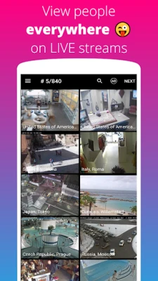 Live Camera îți permite să vezi gratuit mii de camere web live, de la străzile orașului tău până în colțuri îndepărtate ale lumii. Monitorizează traficul, vremea, activitatea oamenilor și animalelor. Explorează destinații noi prin cea mai mare bază de date globală de supraveghere CCTV și camere IP. Descoperă lumea în timp real.